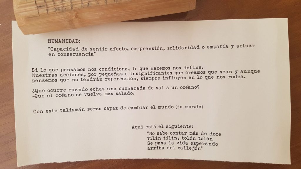 Es la nota que encontré en la torre del pantano, HUMANIDAD. Confirma lo que creía de la sal y da otra pista para seguir el juego. «Tilín Tilín, Tolón Tolón» Tiene que ser un reloj… ¿en el campanario de la Iglesia?